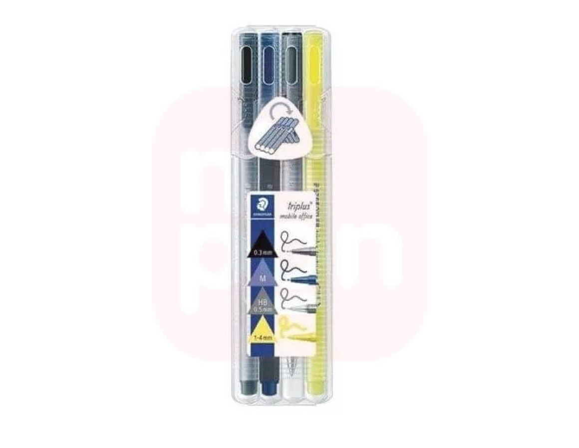 Estojo plástico contendo: 1 Caneta triplus fineliner preta; 1 Caneta triplus ball azul; 1 Lapiseira triplus micro 0,5 mm 1 Marcador fluorescente triplus textsurfer amarelo.